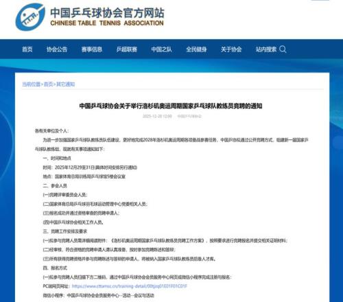中國乒乓球協(xié)會官網(wǎng)于12月20日正式發(fā)布了《中國乒乓球協(xié)會關(guān)于舉行洛杉磯奧運周期國家乒乓球隊教練員競聘的通知》,標(biāo)志著為期三天的新周期國家隊教練員公開競聘工作將于本月29日正式啟動。