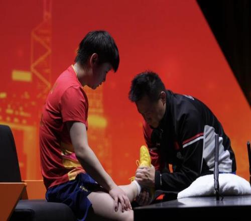 12月13日,孫穎莎在比賽中接受治療。新華社發(fā)(呂小煒攝)