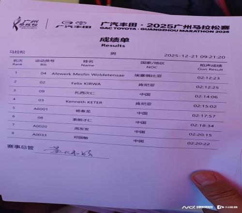 南都訊 記者汪雅云 12月21日7時(shí),2025廣州馬拉松賽激情開(kāi)跑。最終,來(lái)自埃塞俄比亞的選手阿費(fèi)沃克·梅斯芬·沃爾德騰薩耶以2小時(shí)12分23秒的成績(jī)奪得男子組冠軍。而來(lái)自埃塞俄比亞的喬伊斯?切普凱莫伊以2小時(shí)22分40秒的成績(jī)奪得女子組冠軍。