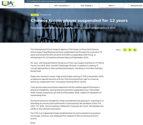 此次公告并非孤例。僅2025年至今,ITIA已公布全球范圍內(nèi)54名網(wǎng)球運(yùn)動(dòng)員及官員涉及腐敗事件。其中,亦有中國網(wǎng)球運(yùn)動(dòng)員卷入其中。ITIA上月曾公告,三名中國球員因違反TACP而被制裁:21歲的李文夫(職業(yè)生涯最高世界單打排名1572名)、張瑾(職業(yè)生涯最高世界單打排名1285名)承認(rèn)收受賄賂操縱比賽,分別被禁賽兩年零三個(gè)月、罰款2萬美元,和禁賽兩年、罰款15000美元;23歲的陸鵬宇(職業(yè)生涯最高世界單打排名896名)則還在接受審議,被暫時(shí)禁賽。