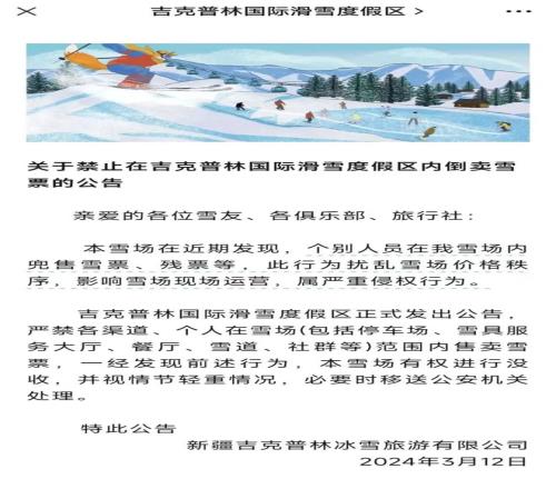 ▲ 新疆吉克普林滑雪場曾經(jīng)發(fā)布公告禁止倒賣雪票。圖 / 吉克普林國際滑雪度假區(qū)公眾號