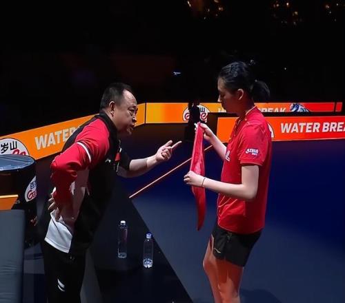 第七局開(kāi)始,陳熠的開(kāi)局有所好轉(zhuǎn),連得2分,繼而取得4比2領(lǐng)先。朱雨玲的比賽經(jīng)驗(yàn)非常豐富,她接發(fā)球搶攻連得2分,追到了4比4。陳熠叫了暫停。李大成指導(dǎo)叮囑陳熠要堅(jiān)定,一定要咬住。