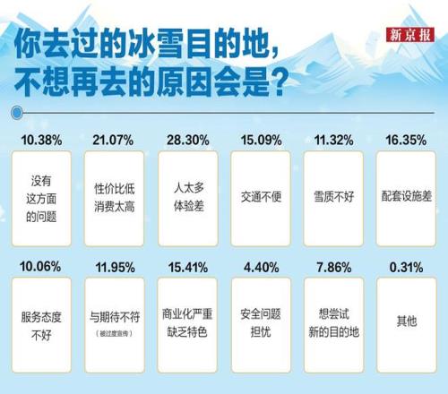 從冰雪目的地的選擇上來看,Z世代的選擇高度集中?!秷蟾妗凤@示,超過八成受訪者將東北列為冰雪游首選,哈爾濱以近七成的提及率領(lǐng)先。但與此同時,“人太多體驗(yàn)差”是Z世代不想再去某目的地的首要原因,占比達(dá)28.3%,“性價比低”和“配套設(shè)施差”緊隨其后。