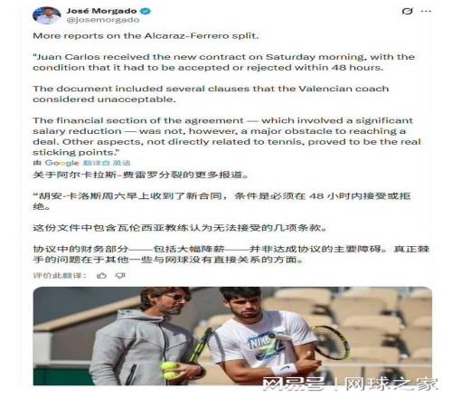 休賽季,當(dāng)阿爾卡拉斯團(tuán)隊(duì)給費(fèi)雷羅48小時(shí)考慮簽署新合同時(shí),費(fèi)雷羅一直猶豫沒有簽字。問題的關(guān)鍵分歧點(diǎn)并非是新合同中的薪資問題——因?yàn)橘M(fèi)雷羅在薪水方面仍有談判空間。真正的癥結(jié)在于阿爾卡拉斯團(tuán)隊(duì)堅(jiān)持:為了有更多時(shí)間陪伴家人,之后阿爾卡拉斯將主要在家鄉(xiāng)穆爾西亞訓(xùn)練,不再前往費(fèi)雷羅網(wǎng)校備戰(zhàn)。